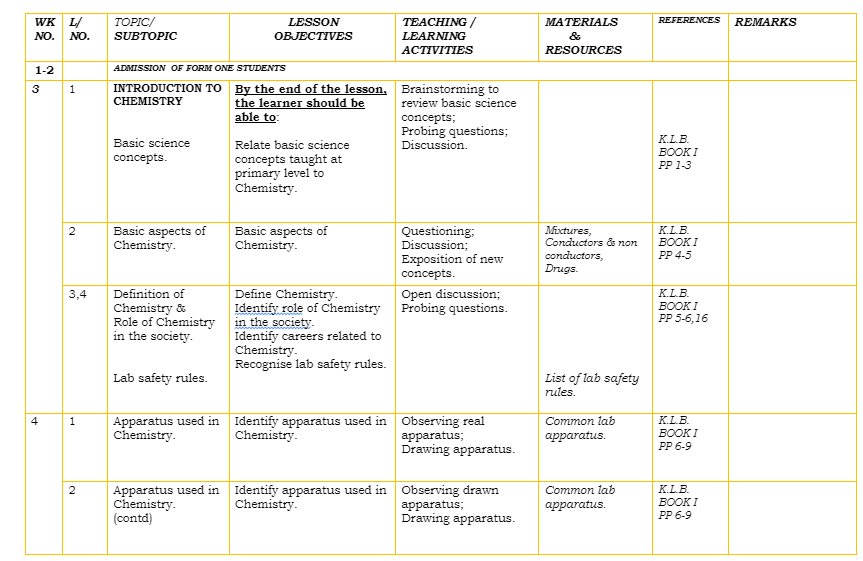 CHEMISTRY FORM 1 2024 CHEMISTRY SOW